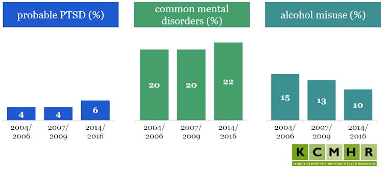 Results from two earlier phases (in 2004-2006 and 2007-2009) have already been published. Outcomes from the latest phase of our study, based on data gathered from over 8,000 military personnel between 2014 and 2016, tell us that the overall rate of PTSD among serving personnel and veterans is 6%, compared with 4% in the earlier two phases. While levels of PTSD in our military sample were similar to those in the general population in 2004-2006 and 2007-2009, the rates have now risen.